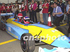 第五十屆澳門格蘭披治大賽車九日特意為澳門市民安排了用雙座位雷諾方程式2000接載乘客的活動,圖為坐在賽車后座上的這位幸運市民起跑時豎起大姆指,興奮之情溢于言表。中新社記者:李剛