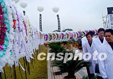 圖為會場四周擺滿了各界群眾敬獻(xiàn)的花圈。