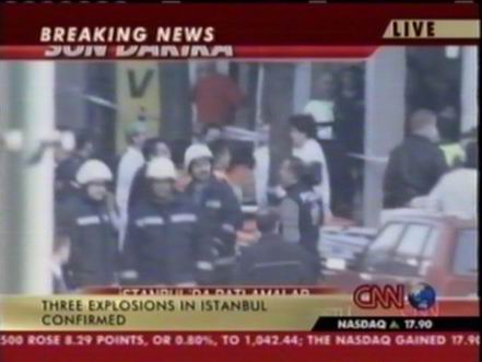 北京時間11月20日下午,位于土耳其伊斯坦布爾北部的土耳其匯豐銀行總部附近發生兩次爆炸,部分銀行建筑被摧毀。此后英國駐伊斯坦布爾領事館以及一個居民區和一座清真寺也遭到襲擊。圖為土耳其警察趕到爆炸現場。(春風)