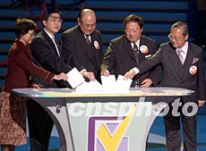 香港政制事務局局長林瑞麟(左二)、民政事務局局長何志平(右二)、選舉管理委員會主席胡國興(中),十一月二十二日在為區議會選舉的電視特別節目中向選民示范如何正確投票。中新社記者:潘索菲