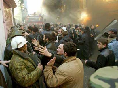 在成功控制格魯吉亞議會(huì)大廈后,格魯吉亞反對(duì)派又包圍了總統(tǒng)府。圖為格魯吉亞反對(duì)派與總統(tǒng)府外的警察發(fā)生沖突。(人民網(wǎng)圖)