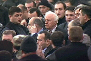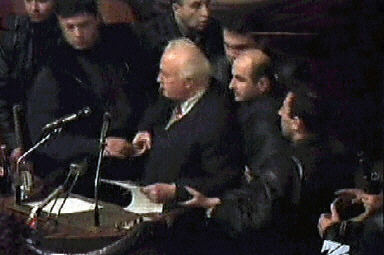11月22日,格魯吉亞新一屆議會舉行第一次會議。當謝瓦爾德納澤在議會演講時,幾十名反對派人士沖入議會大廈,要求總統辭職。總統的支持者和反對派人士發生爭執,議會大廳一片混亂。謝瓦爾德納澤隨即在保鏢的保護下撤離,并表示拒絕辭職。