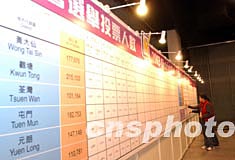 香港特區(qū)11月23日舉行區(qū)議會(huì)選舉,一萬(wàn)名工作人員在四百二十多個(gè)不同的投票站,由早上七時(shí)半至晚上十時(shí)半為市民服務(wù)。圖為工作人員在張貼各區(qū)投票率和選舉結(jié)果。中新社記者:洪少葵