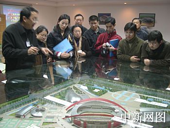 圖:網絡媒體記者在了解河西奧體中心體育場館建設工程進展情況