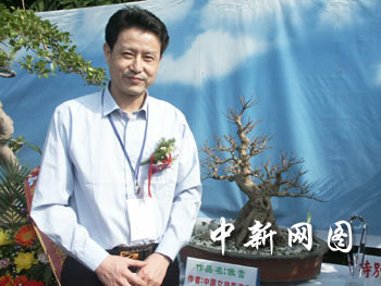 陳忠和與他的盆景作品《傲雪》在一起。蔡文原 攝