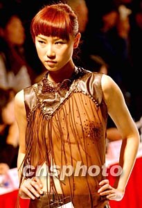 一名模特身著中國大學生設計的咖啡色透視裝,展示迷人風采,參加十一月北京舉行的“杉杉杯”中國時裝設計新人獎評選。中新社記者:賈國榮