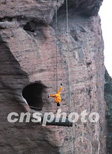 十二月,江西省鷹潭市龍虎山風景名勝區工作人員向游人重現兩千年前古人吊裝懸棺的驚險過程。該景區擁有數百座崖墓,這些崖墓距水面十至六十米之間的峭壁上,專家認為古代人是利用木絞車、土滑輪、繩索等工具將棺木吊上懸崖洞穴中的。中新社記者:王麗南