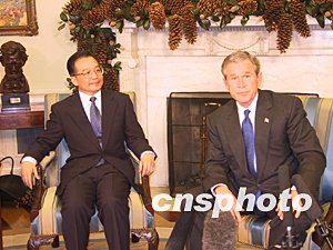 當天上午的歡迎儀式后,溫家寶與布什先進行了小范圍會談,會見了記者,然后雙方又進行了大范圍會談,就中美關系和一些重大國際問題交換了看法。