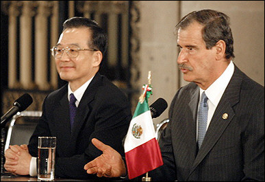 會談開始前,福克斯在國民宮中央庭院為溫家寶正式訪問墨西哥舉行歡迎儀式。在軍樂隊演奏了兩國國歌后,福克斯致詞熱烈歡迎溫家寶訪墨。他表示,溫總理首次出訪即選擇了墨西哥,表明兩國都期待著進一步加強雙邊關系。中國在國際舞臺上作用日益重要,墨西哥愿與中國一道為共同營造更繁榮、更平等的世界而努力。溫家寶在答詞中表示期望通過訪問,與墨方增強互信、擴大共識、深化合作、共謀發展,使兩國友好合作關系進入新的發展時期。隨后,兩國領導人檢閱了儀仗隊。溫家寶和福克斯還走到少年兒童歡迎隊伍中,慈愛地與他們擁抱和握手,引起孩子們的陣陣歡呼和掌聲。