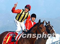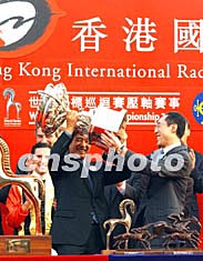 世界馬壇盛事──香港國際賽馬日十二月十四日在此間沙田馬場舉行,其包括香港杯、香港瓶、香港一哩錦標、香港短途錦標以及六場本地賽事,香港隊榮獲短途錦標和一哩錦標兩項桂冠。圖為香港“精英大師”獲短途錦標頭馬后,受到全場馬迷歡呼。中新社記者:潘索菲