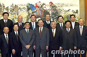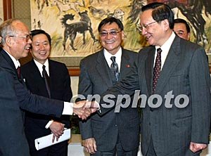 國務委員唐家璇十五日在北京會見香港前高級公務員協會代表團一行,國務院港澳辦副主任陳佐洱(左二)參加了會見。中新社記者:滿會喬
