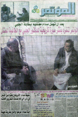 12月18日,伊拉克一份報紙刊登了伊拉克臨時管理委員會成員沙拉比(左)與被捕后薩達姆見面的照片。