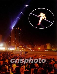 十二月十八日夜晚,被譽為“高空王子”的阿迪力在廣東汕頭上空成功走過一根四百二十六米長的鋼索。作者:杜一方