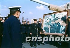毛澤東于1953年2月19日首次視察解放軍海軍部隊,在武漢登上“洛陽”艦和該艦官兵一起航行,并揮毫題詞:“為了反對帝國主義的侵略,我們一定要建立強大的海軍”。“洛陽”艦官兵12月20日在毛主席與“洛陽”艦官兵交談的巨幅照片前重溫領袖題詞,紀念毛澤東誕辰110周年。作者:毛昭勝