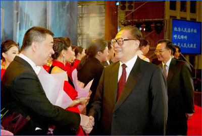 音樂會結(jié)束后,江澤民、溫家寶、曾慶紅、吳官正、李長春等黨和國家領(lǐng)導(dǎo)人走上舞臺,與參加演出的演員親切握手,祝賀演出成功。