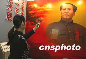 十二月二十七日,在北京毛主席紀念堂舉行的紀念毛澤東誕辰110周年書畫藝術展不但吸引了眾多老年人,也令不少年輕人流連忘返。一名女青年用新購買的可拍照手機拍攝令人著迷的毛澤東像。中新社記者:任晨鳴