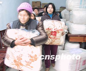 受重慶市開縣高橋鎮的川東北氣礦一礦井天然氣“井噴”影響轉移的民眾,26日領取當地政府發放的救災物資。作者:鄒輝