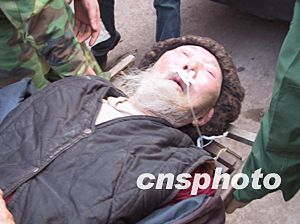 重慶市開縣高橋鎮的川東北氣礦一礦井天然氣“井噴”事故受到控制后,醫務人員繼續救治一受傷老人。作者:鄒輝