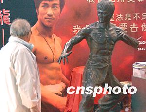 連日來在香港會展中心舉行的“亞洲游戲展2003”每天吸引眾多參觀者,圖為展會上李小龍的雕像引人注目。作者:錢興強