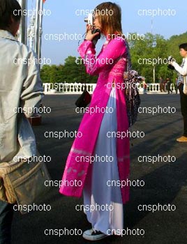 新年前,一位身著越南旗袍的中國姑娘在越南一旅游區拍照。這種被譽為越南國服的旗袍受到一些中國姑娘喜歡。宋吉河 攝