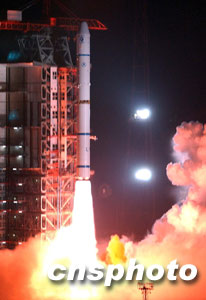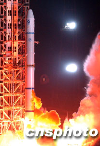 北京時間三十日凌晨三時許,中國“雙星計劃”的第一顆衛星“探測一號”在西昌衛星發射中心由“長征二號丙”改進型運載火箭發射升空。至此,二00三年中國六次航天發射全部告捷,也為中國航天年畫上一個圓滿的句號。本次衛星發射是中國運載火箭迄今為止最高的一次飛行,“探測一號”也因此成為中國目前軌道距地球最遠的一顆衛星。 中新社記者 張煒 攝