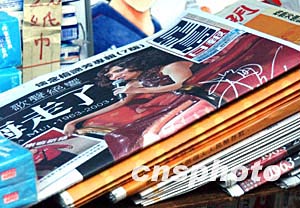 藝人梅艷芳因子宮頸癌導(dǎo)致肺功能失調(diào),于十二月三十日凌晨二時(shí)五十分在香港病逝,香港部份媒體連夜趕工再版,刊登最新消息,致使三十日?qǐng)?bào)紙有不同版本。圖為清晨香港報(bào)攤加緊整理報(bào)紙以饗讀者。中新社記者:錢興強(qiáng)