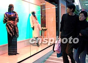 元旦過后春節將至,北京一些商家為了吸引了顧客周日在櫥窗里上演真人模特秀。作者:張雷