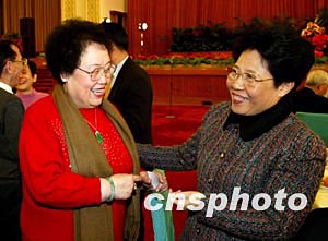 2004年僑界新春茶話會十四日在北京人民大會堂舉行,國務院僑務辦公室主任陳玉杰(右)與全國政協委員、香港富商陳麗華親切交談。中新社記者 毛建軍 攝