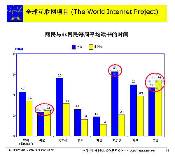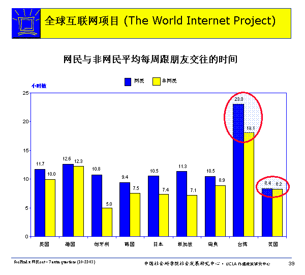 在所有調查的國家里,網民平均每周與朋友交往的時間多于非網民。而只有在美國和德國,網民和非網民與朋友交往的平均時間基本是一致的。