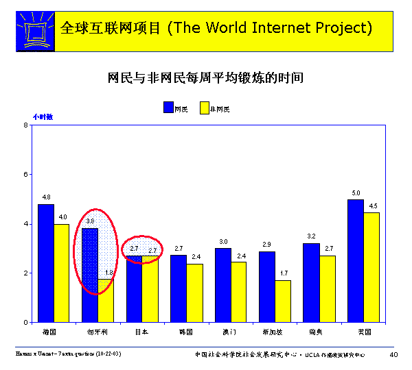 網民平均每周的鍛煉時間多于非網民,日本除外。