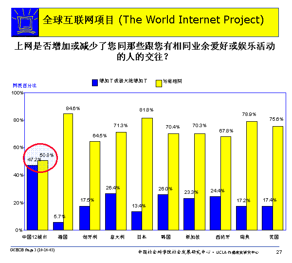 然而,還是有相當數量的網民認為使用互聯網增加了他們同跟他們有相同業余愛好或相同娛樂活動的人的交往;這樣的網民在中國最多,47.2%被調查的中國互聯網網民認為互聯網增加了增加或極大的增加了交往。
