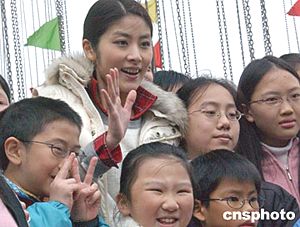 香港歌星陳慧琳元月十七日參加正在添馬艦廣場舉行的環球嘉年華活動,為“空中秋千”機動游戲擔任操作員并與小朋友一起蕩秋千。作者:錢興強