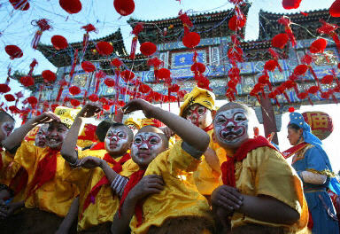 中國京劇中的“金猴”為北京地壇廟會增添喜慶氣氛。逛廟會是北京傳統的游園活動。