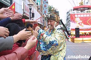 活動中裝扮一新的“財神”正給市民和游客派利是(紅包)。作者:何雪妍