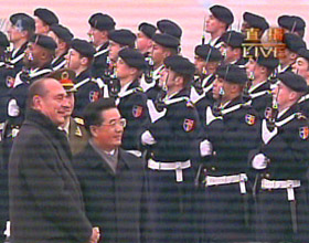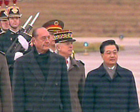 中國國家主席胡錦濤乘專機于巴黎時間下午兩點四十分抵達巴黎奧利機場,開始對法國進行國事訪問,法國總統希拉克夫婦親自到機場迎接。(電視截圖)