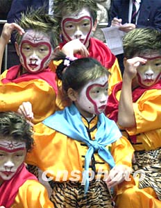香港時(shí)代廣場(chǎng)元月二十七日舉行十周年慶典活動(dòng),為隆重其事特安排“甲申猴年金猴鬧獅賀新春”表演,圖為“群猴賀禧”。作者:錢興強(qiáng)