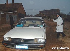 疫區工作人員對出入車輛進行嚴格消毒。作者:艾啟平 徐晶波