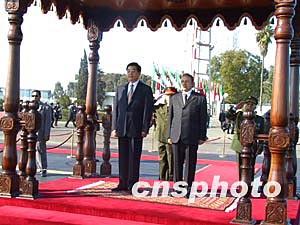 三日下午,胡錦濤抵達阿爾及爾,開始他此次歐非四國之行的最后一站。傍晚,當胡錦濤來到位于阿爾及爾市郊穆拉迪高地的總統(tǒng)府時,總統(tǒng)府儀仗隊持槍敬禮,軍樂隊奏起歡迎曲。在胡錦濤檢閱了總統(tǒng)府儀仗隊后,等候在門前的布特弗利卡迎上前去,與胡錦濤熱烈握手歡迎。這是自去年法國埃維昂南北領(lǐng)導人非正式對話會后,胡錦濤同布特弗利卡的第二次會晤。