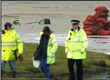 圖:英國(guó)警察站在英格蘭西北部莫克姆灣海灘(2月7日11:50)