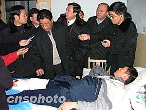 二月十五日十一時許,吉林市中百商廈發生特大火災。截至十六日上午,已知有五十三人喪生,另有七十人受傷被送醫院治療。圖為吉林省有關官員到醫院看望傷者。吳兆飛 攝