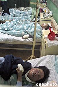 火災造成四十人死亡,三人受傷。死者全系中老年女性,其中八十歲以上女性十人,死者平均年齡為七十二歲。圖為從火災現場僥幸逃生的傷者在醫院接受搶救。作者:張茵