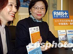中信嘉華銀行二月二十六日在香港推出優越個人人民幣服務,“RMB+中港一線通服務”,包括個人人民幣服務及與CEPA相關的商業服務,專為需要中國有關的銀行服務客戶提供增值的財務配套支持。圖為該銀行執行副總裁林劉德美(右)和高級副總裁李笑英向傳媒介紹優越個人人民幣系列服務內容。作者:錢興強