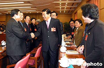 “老領導,歡迎你回來!”、“老書記您還記得我呀!”“老首長您的氣色也不錯”……提前二十分鐘到達北京團的賈慶林信步走到代表中間,繞場一周,與坐在前排的代表一一握手,噓寒問暖。