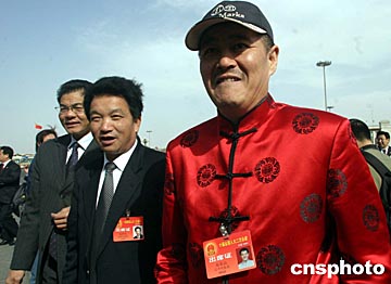 三月十日下午,十屆全國人大二次會議舉行第四次全體會議聽取常委會和兩高報告,全國人大代表、著名喜劇明星趙本山身著紅色唐裝出席大會。中新社記者:張勤