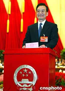 十屆全國人大二次會議三月十四日在北京人民大會堂舉行閉幕式,國務院總理溫家寶投票表決“憲法修正案草案”。中新社記者:毛建軍