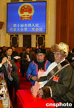 十屆全國人大二次會議三月十四日在北京人民大會堂舉行閉幕式,藏族人大代表投票表決“憲法修正案草案”。中新社記者:毛建軍