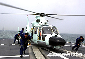 三月十六日,在青島進行的中法聯合軍事演習中,中國海軍112驅逐艦上直升機正在迅速起飛。中新社記者:宋吉河