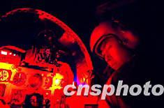 三月中旬,擔負空軍最新噴氣式教練機首訓任務的濟空某飛院,組織該機新學員進行夜航訓練。圖為夜幕下飛行員在五彩斑斕的座倉里架駛戰(zhàn)鷹。作者:崔文斌