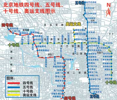 據報道,北京地鐵四號線全長28.16公里,共設24座車站,南起豐臺馬家樓,北至海淀區龍背村。北京地鐵五號線全長27.6公里,共設22座車站,南起豐臺區宋家莊,北至昌平區北太平村。北京地鐵十號線全長24.55公里,共設22座車站,南起朝陽區勁松,西至海淀區萬柳。奧運支線全長5.91公里,共設4座車站,南起熊貓環島,北至奧體森林公園。