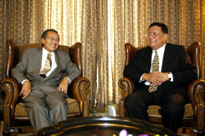 馬來西亞前首相馬哈蒂爾在代表團(tuán)下塌的酒店會見了劉長樂和代表團(tuán)一行。這位鳳凰衛(wèi)視的老朋友曾在第一屆博鰲亞洲論壇上接受過鳳凰的獨(dú)家訪問,在去年的世界華商大會上又特別回答了鳳凰記者的提問,中馬建交30年前夕,當(dāng)時即將告別政壇的馬哈蒂爾接受了鳳凰主持人陳魯豫的專訪。這次的會見友好、親切,綠野集團(tuán)創(chuàng)辦人丹斯理李金友先生會見時在座。